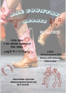 Le Dimanche 06 Avril 2025, Après Midi Bal Country à 13h30 chez *Amazone Country*, Foyer Rural , 03 rue Georges Clemenceau , à Rebais (77510), Seine et Marne.