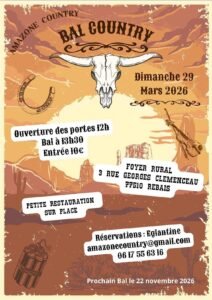 Le Dimanche 29 Mars 2026, Après Midi Bal Country des *Amazone Country*, à 13h30, Foyer Rural, 3 rue Georges Clémenceau, à Rebais (77510), Seine et Marne.