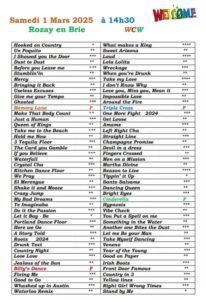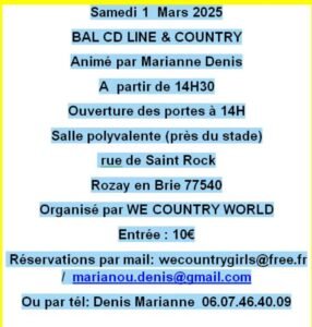 Le Samedi 1er Mars 2025, Après Midi Bal Line et Country cd, chez *We Country World* à 14h30, Salle Polyvalente, près du Stade rue de St Rock, à Rozay en Brie (77540), Sein