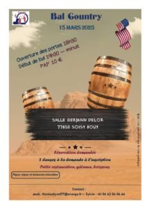 Le Samedi 15 Mars 2025, Bal Country de 19h30 à Minuit, chez *Kentucky WD 77*, Salle Germain Delor, à Soisy Bouy (77650), Seine et Marne.