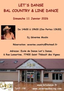 al Country et Line Dance chez *Let’s Danse*, animée par *DJ Séverine Moulin*, de 14h00 à 19h00, Ecole de Danse , 6 rue Lamartine, à St Thibault des Vignes (77400), Seine et Marne.