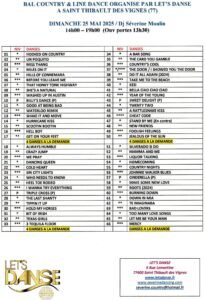 Le Dimanche 25 Mai 2025, Après Midi Bal Country et Line Dance animée par *DJ Séverine Moulin*, de 14h00 à 19h00, Ecole de Danse *Let’s Danse*, 6 rue Lamartine, à St Thibault des Vignes (77400), Seine et Marne.