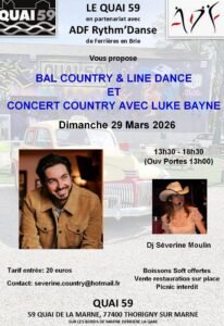 Le Dimanche 29 Mars 2026, Après Midi Bal Country et Line Dance animé par *DJ Séverine Moulin*, avec * Luke Bayne*, de 13