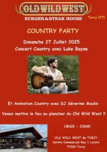 Le Dimanche 27 Juillet 2025, Soirée Country avec Concert de *Luke Bayne*, et Animation Country avec *Séverine Moulin*, sur le Plancher de *Old Wild West*, de 18h00 à 22h00, Centre Commercial Bay 1 Loisirs, à Torcy (77200), Seine