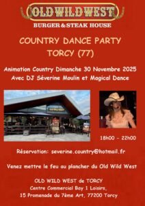 Le Dimanche 30 Novembre 2025, Soirée Country Dance Party avec *DJ Séverine Moulin et Magical Dance*, de 18h00 à 22h00, Old Wild West , Centre Commercial , Bay 1 Loisirs, 15 Promenade du 7ème Art, à Torcy (77200), Seine et Marne.