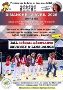 Le Dimanche 12 Avril 2026, Après Midi Country Dance de 14h00 à 18h00, avec Bal Spécial Débutants, Salle Multi Activités, 61 rue des Pecheurs, à Vaires sur Marne (77360), Seine et Marne.