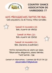 Le Samedi 14 Mars 2026, Bal Country à 13h30, chez *Country Dance Association*, Salle Polyvalente, rue de L’Ourcs, à Varreddes (77910), Seine et Marne.