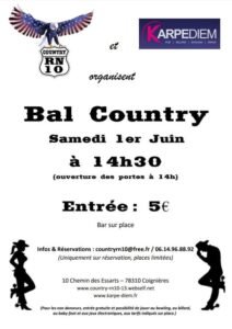 Le Samedi 1er Juin 2024, Après Midi Country Dance à 14h30, chez *Country RN10*, 10, Chemin des Essarts, à Coignières (78310), Yvelines.