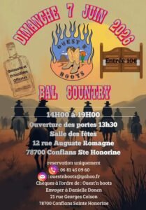 Le Dimanche 07 Juin 2026, Après Midi Bal Country des *Ouest ‘N Boots*, de 14h00 à 19h00, Salle des Fetes, 12 rue Auguste Romagne, à Conflans Ste Honrine (78700)
