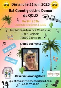 Le Dimanche 21 Juin 2026, Après Midi Bal Country et Line Dance du *QCLD*, animée par *Adela*,