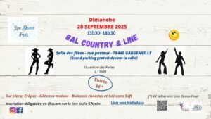 Le Dimanche 28 Septembre 2025, Bal Country et Line, de 13h30 à 18h30, Salle des Fetes, rue Pasteur, à Gargenville (78440), Yvelines.