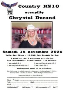 Le Samedi 15 Novembre 2025, Journée Country chez *Country RN 10*, à partir de 14h00, avec 3 Workshops de *Chrystel Durand*et Bal, Salle des Fetes d