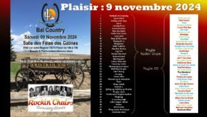 Le Samedi 09 Novembre 2024, Après Midi Bal Country , de 14h00 à 19h00, avec un Concert de *Rocki’n Chairs Country Music*, 2564, rue Jules Régnier, à Plaisir (