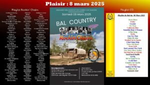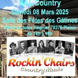 Le Samedi 08 Mars 2025,Après Midi Country Music et Dance , avec Concert de *Rockin’Chairs Country Music*, de 14h00 à 19h00, Salle des Fetes des Gatines, 2564, rue Jules Régnier, à Pla