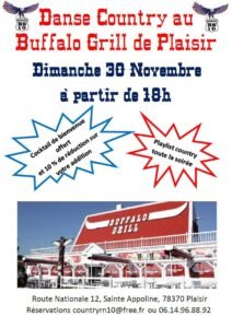 Le Dimanche 30 Novembre 2025, Soirée Country à partir de 18h00, au Buffalo Grill, Route Nationale 12, Ste Appoline, à Plaisir (78370), Yvelines.