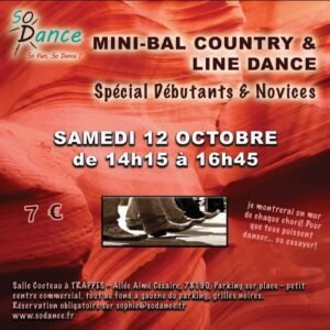 Le Samedi 12 Octobre 2024, Mini Bal Country et Line Dance, Spécial Débutants et Novices, de 14h15 à 16h45, Salle Cocteau, Allée Aimé Sésaire, à Trappes (78190), Yvelines.