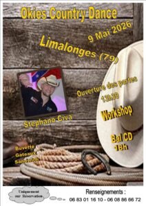 Le Samedi 09 Mai 2026, Journée Country chez *Okies Country Dance*, à partir de 13h30, avec Workshop de *Stephano Civa* et Bal cd à 18h00, à Limalonges (79), Deux Sèvres.
