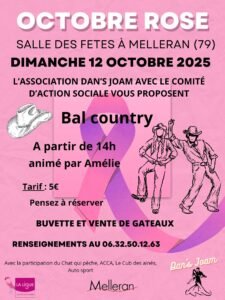 Le Dimanche 12 Octobre 2025, Après Midi Bal Country (Rose) animée par *Amélie*, , à 14h00, Salle des Fetes de Melleran (79) , Deux Sèvres.