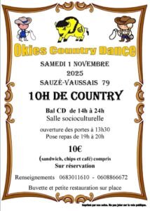 Le Samedi 1er Novembre 2025, Bal Country des *Okies Country Dance*, 10 h de Country, de 14h00 à 24h00, Salle Socioculturelle de Sauzé Vaussais (79), Deux Sèvres.