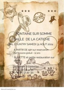 Le Samedi 31 Aout 2024, Bal Country à 19h00, Salle de la Catiche, à Fontaine sur Somme (80), Somme.