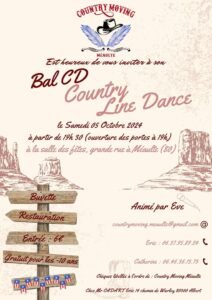 Le Samedi 05 Octobre 2024, Bal Country Line Dance cd, chez *Country Moving*, à partir de 19h30, Salle des Fetes , Grande Rue, à Méaulte (80), Somme.