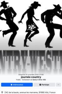 Le Dimanche 24 Novembre 2024, Journée Country à partir de 11h00, au *Samy’s Diner *, Zac de la Baute, Avenue les Marranes, à Albi (81990), Tarn.