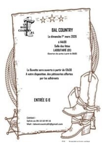 Le Dimanche 1er Mars 2026, Après Midi Bal Country chez *Laboot Country 81*, à 14h00, Salle des Fêtes de Laboutarié (81), Tarn.