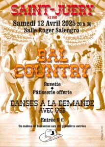 Le Samedi 12 Avril 2025, Bal Country à 20h30, Salle Roger Salengro, à St Juery (81160), Tarn.