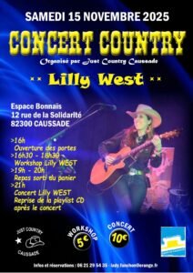 Le Samedi 15 Novembre 2025, Journée Country chez *Just Country*, à partir de 16h00, avec *Lilly West * pour le Workshop et le Concert à 21h00, Espace Bonnais, 12, rue