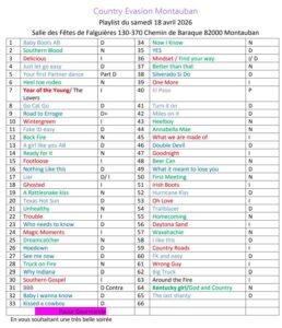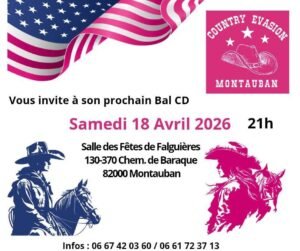 Le Samedi 18 Avril 2026, Bal Country cd des *Country Evasion Montauban*, à 21h00, Salle des Fêtes de Flaguières, 130.370. Chemin de Baraque, à Montauban (82000), Tarn et Garonne.