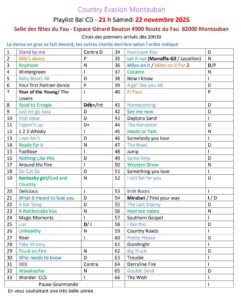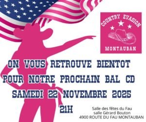 Le Samedi 22 Novembre 2025, Bal Country cd des *Country Evasion Montauban*, à 21h00, Salle des Fêtes Gérard Bouton, 4900 Route du Fau Montauban (82) Tarn et Garonne.