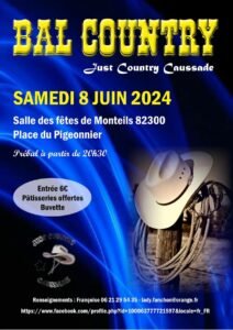 Le Samedi 08 Juin 2024, Bal Country chez *Just Country Caussade*, à partir de 20h30, Salle des Fetes, Place du Pigeonnier, à Monteils (82300), Tarn et Garonne.