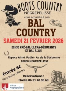 Le Samedi 21 Février 2026, Bal Country des *Boots Country*, à 21h00, Espace Aimé Padié, Avenue de la Sorbonne, à Negrepelisse (82800), Tarn et Garonne.