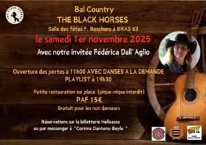 Le Samedi 1er Novembre 2025, Journée Country chez *The Black Horses*, à partir de 11h00, avec Danses à la demande et Playlist à 19h30, avec *Fédérica Dall ‘Aglio*, Salle des Fetes F.Boschero, à Bras (83), Var.