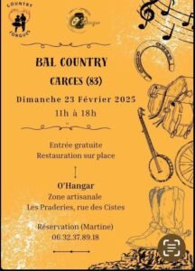 Le Dimanche 23 Février 2025, Après Midi Bal Country chez *Country Lorgues*, de 11h00 à 18h00, O’Hangar, Zone Artisanale Les Praderies, rue des Cistes, à Carces (83), Var.