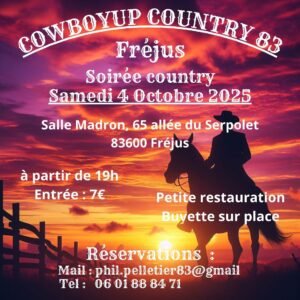 Le Samedi 04 Octobre 2025, Soirée Country des *Cowboyup Country 83*, à 19h00, Salle Madron, 65 allée du Serpolet, à Frejus (83600), Var .