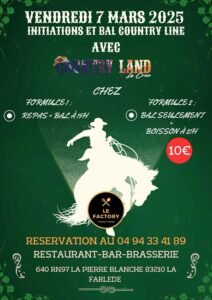 Le Vendredi 07 Mars 2025, Bal Country Line avec Initiationschez *Country Land*, à 21h00, *Le Factory*, 640, RN97, La Pierre Blanche, La Farlède (83210), Var.