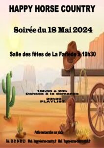 Le Samedi 18 Mai 2024, Soirée Country chez *Happy Horse Country*, à 20h00, Salle des Fetes de La Farlède (83), Var.