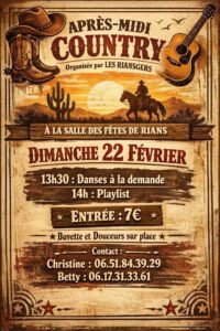 Le Dimanche 22 Février 2026, Après Midi Bal Country chez *Les Riansgers*, à 14h00, Salle des Fêtes de Rians (83), Var.