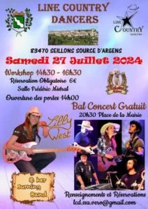 Le Samedi 27 Juillet 2024, Journée Country à partir de 14h30, avec Workshop et Bal Country Concert de *Lilly West*, Place de la Mairie de Seillons Source D’argens (83470),