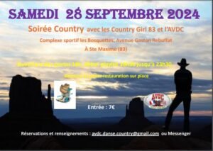 Le Samedi 28 Septembre 2024, Soirée Country avec *Les Country Girl 83 et L’AVDC*, de 18h30 à 23h30, Complexe Sportif *Les Bosquettes*, Avenue Gaston Rebuffat, à Ste Maxime (83), Var.