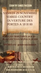 Le Samedi 29 Novembre 2025, Soirée Country à partir de 18h30, chez *Country Dance Passion*, Salle des fêtes de Vinon sur Verdon (83560), Var.