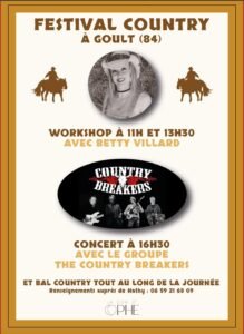 Le Samedi 28 Septembre 2024, Festival Country à partir de 10h00, organisé par *Rio Calaho Country *, à avec Workshop,Concert,Stands,à Goult (84),Vaucluse.