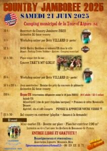 Le Samedi 21 Juin 2025, Journée *Country Jamboree*, animée par *DJ Danse Country, à partir de 10h00,avec Workshop de *Betty Villard*, Concert des *That’s My Girls*, au Camping Municipal de la Tour D’Aigues (84
