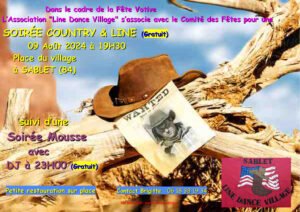 Le Vendredi 09 Aout 2024, Soirée Country et Line , avec *Line Dance Village*, à 19h30, Suivie d’une Soirée Mousse, avec DJ, à 23h00, Place du Village de Sablet (84), Vauclus