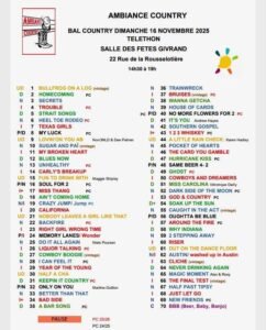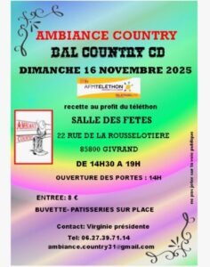 Le Dimanche 16 Novembre 2025, Après Midi Bal Country, chez *Ambiance Country*, de 14h30 à 19h00, Salle des Feres de la Rousselotiere, à Givrand (85800), Vendée.