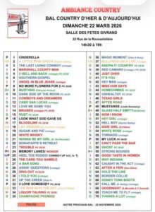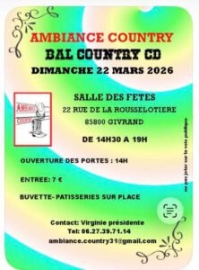 Le Dimanche 22 Mars 2026, Après Midi Bal Country cd de 14h30 à 19h00, chez *Ambiance Country*, Salle des Fêtes, 22 rue de la Rousselotiere , à Givrand (85800), Vendée.