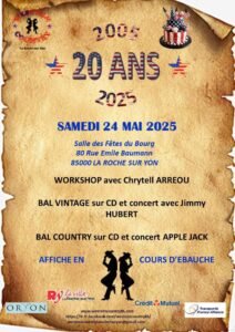Le Samedi 24 Mai 2025, Journée Country pour les 20 ans du Club, avec Workshop de *Chrytell Arreou*, Bal Vintage cd et Bal Country cdd et Concert de *Apple Jack*, Salle des Fetes du