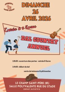 Le Dimanche 26 Avril 2026, Après Midi Bal Country annuel chez *Country Barn Dance*, à 14h00, Salle Polyvalente, rue du Stade, à Le Champ St Père (85), Vendée.