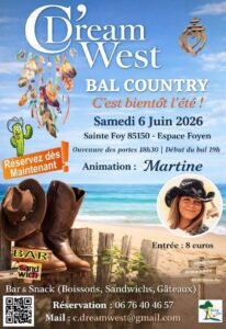 Le Samedi 06 Juin 2026, Bal Country chez *C.Dream West *, animé par *Martine*, à 19h00, Espace Foyen, à Sainte Foy (85150), Vendée.